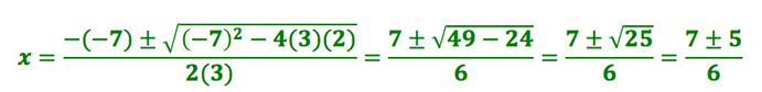 Aquí a = 3, b = -7, c = 2, luego sustituyendo y teniendo presente que al sustituir se pone con signo cambiado, tendremos: